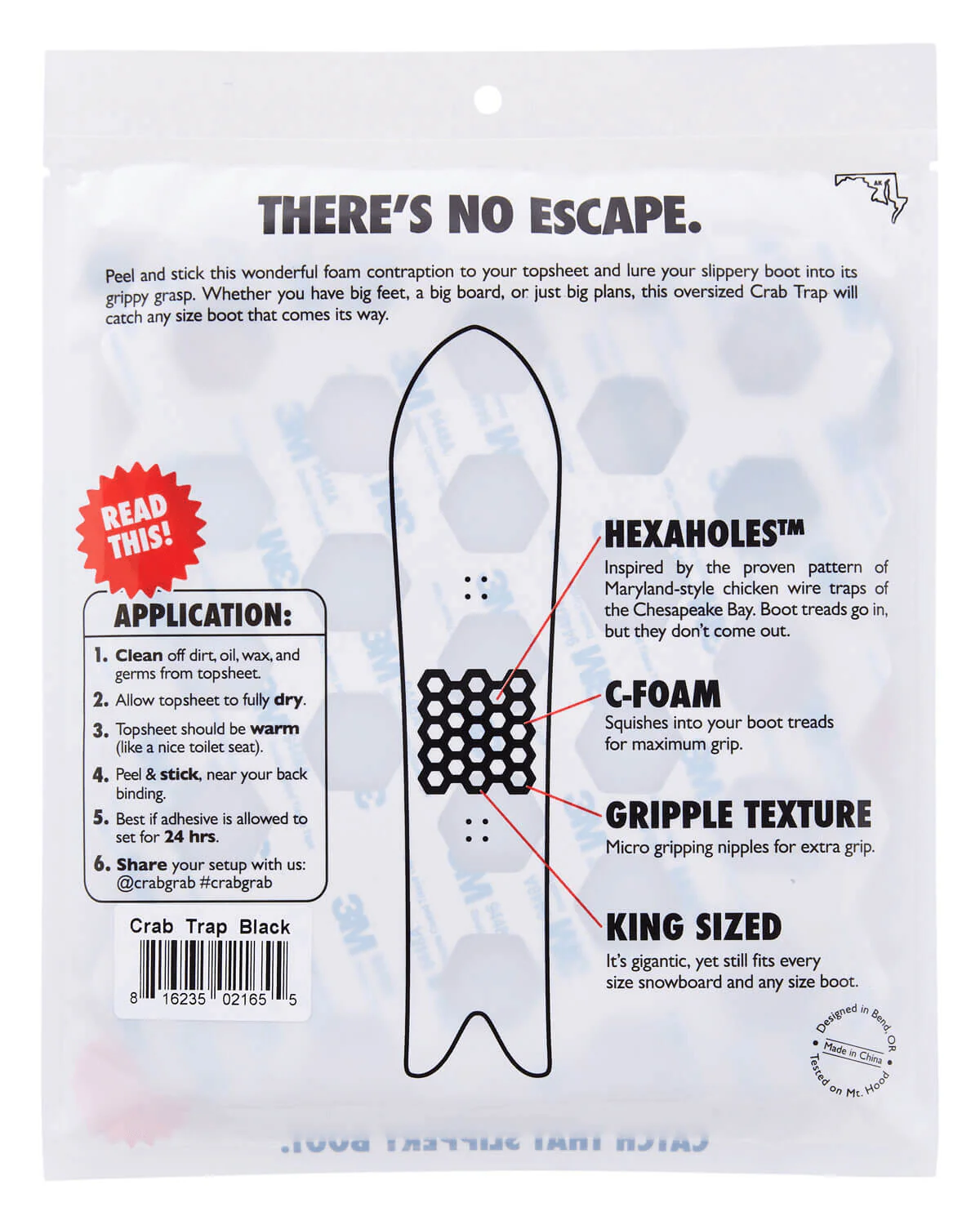 Stick this large format foam traction to your topsheet and lure your slippery boot into its grippy grasp. Whether you have big feet, a big board, or just big plans, this oversized trap will catch any size boot that comes its way. Inspired by the proven pattern of Maryland-style chicken wire traps of the Chesapeake Bay. Boot treads go in, but they don’t come out.