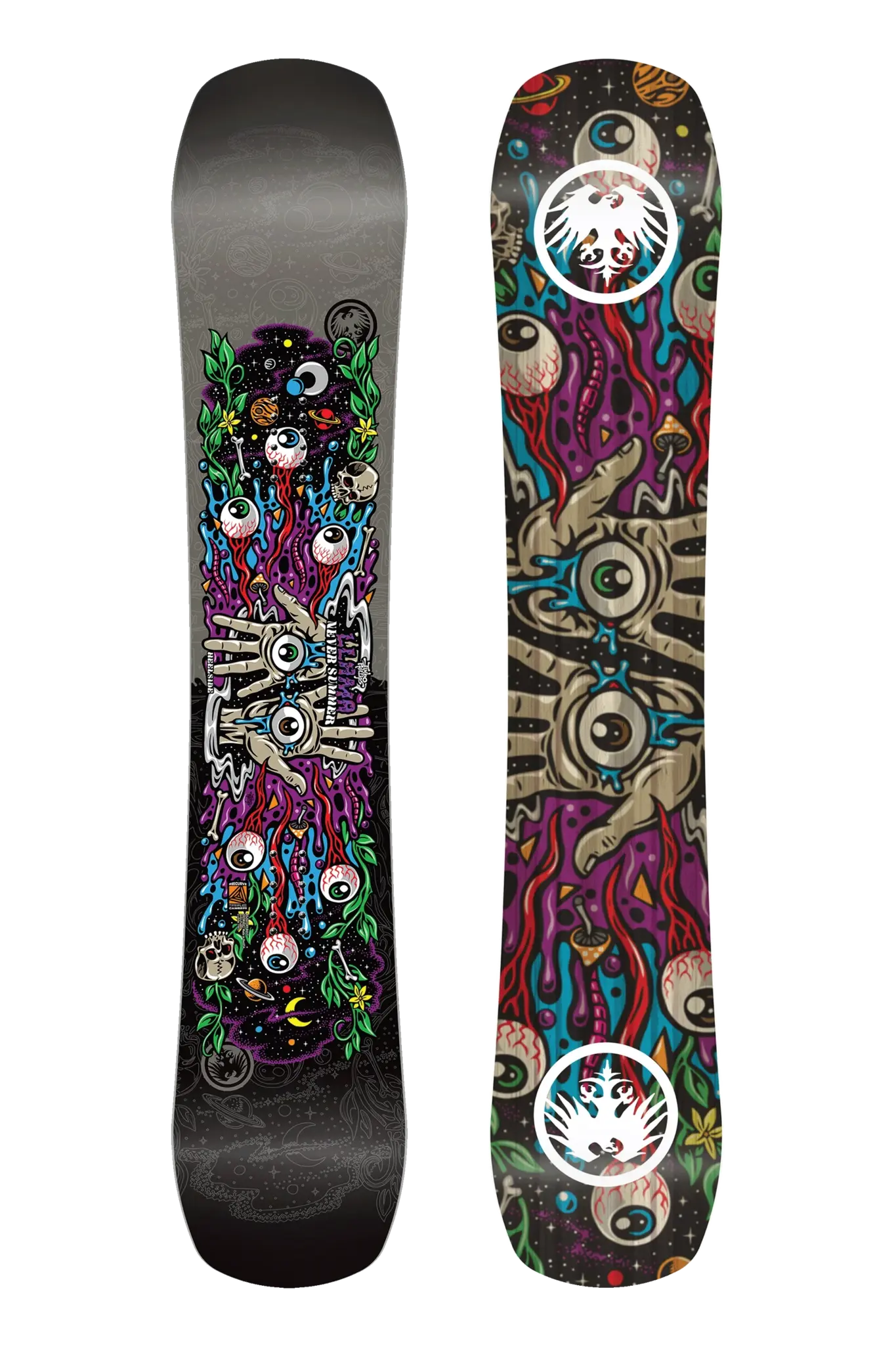 Named for one of Never Summer’s original team riders, Eric ‘The Llama’ Segris, with art by the legendary Jimbo Phillips. A softer-than-midflex asymmetrical twin built for the ultimate freestyle all-mountain rider with Recurve Traditional Camber for explosive pop and smooth, locked-in carves.