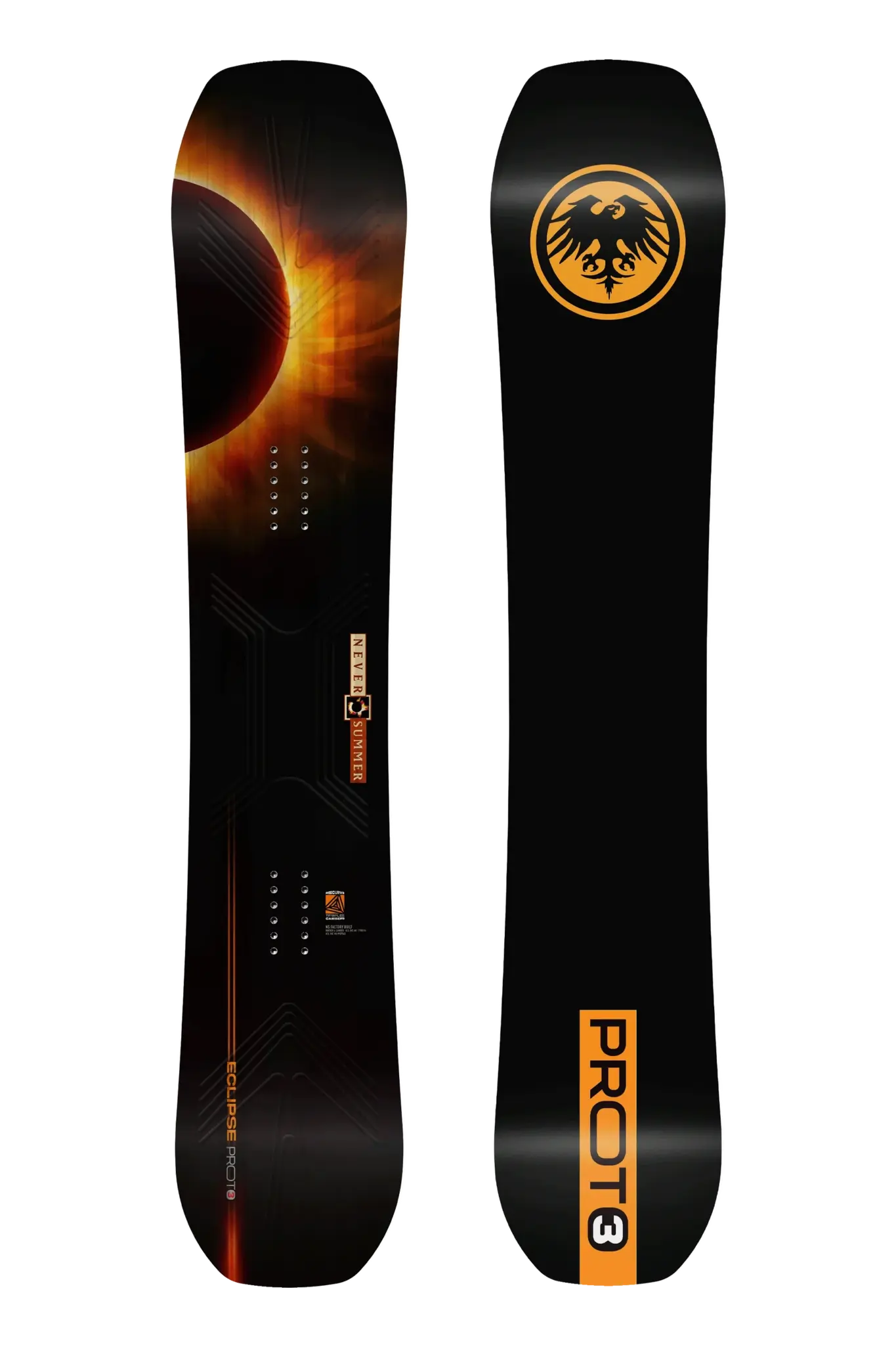 The new Proto T3 Eclipse throws it back to our roots, featuring the first ever Never Summer logo… The Eclipse. The board itself is anything but a throwback. Full of the latest NS snowboard innovations like our Recurve Triple Camber Profile, setback from center and coupled with an extended nose rocker enhancing our Early-Rise and Float Mechanics. What you can’t see might be the biggest thing that sets this board apart. The Precision Stitched Carbon Matrix, aesthetically represented by our T3 Directional Carbon Mapping, combines advanced materials and cutting-edge design. Blurring the lines between Freeride and Freestyle the Eclipse is purpose built for both ends of the spectrum and everything in-between. You’re immediately at home on the Eclipse because it feels like it was designed precisely for you. Our R.I.P. Edge-Hold Technology, 32 mm setback and 10 mm of taper provide unrivaled stability and lighting response. It’s everything you could want in a board and even more you’re not expecting.